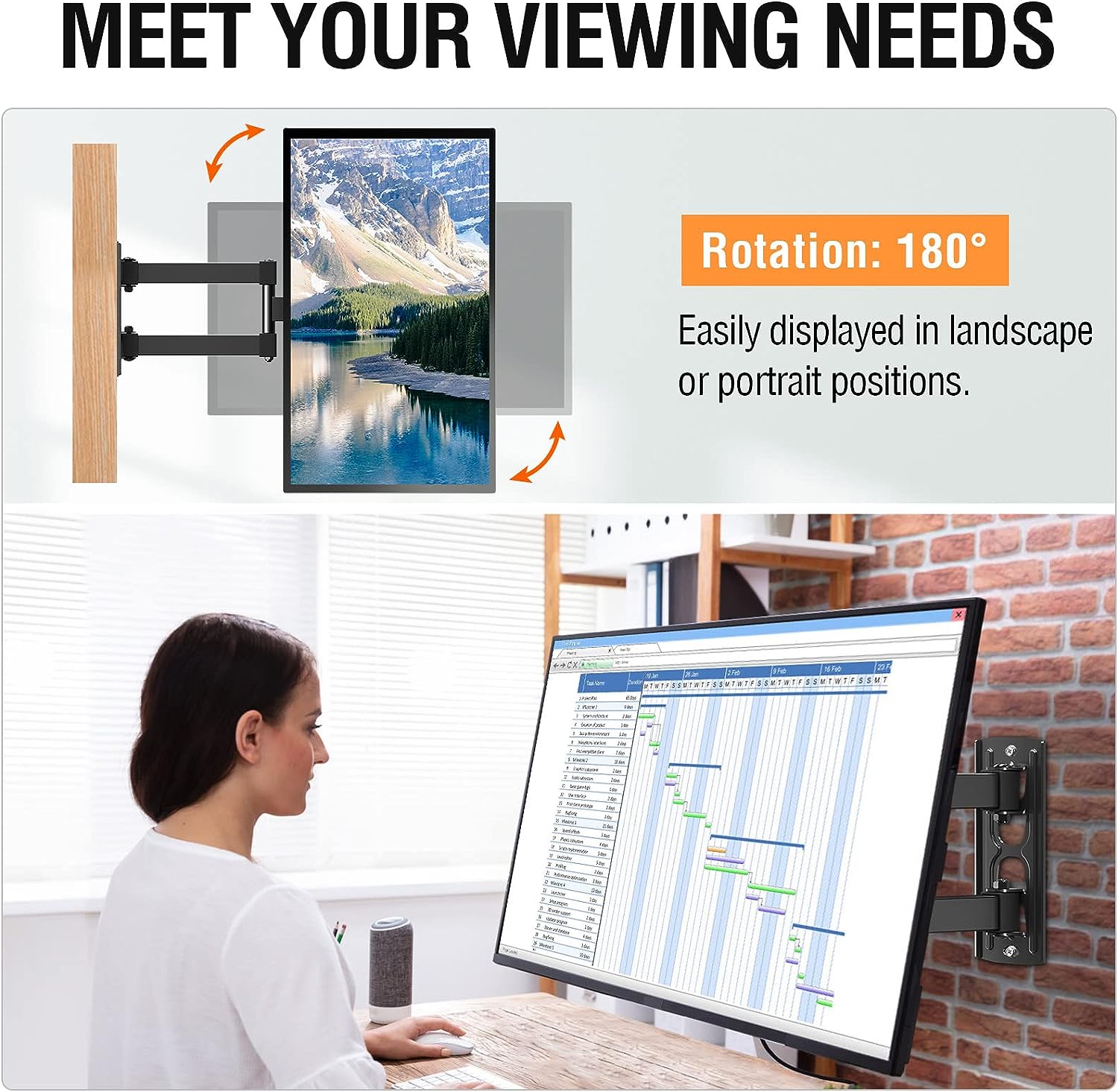 180° Rotation Design - With the 180° rotation unique design, the full motion TV mount can easily display in landscape or portrait position to meet your special need.